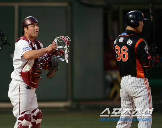 ◇2일 목동 넥센-롯데전에서 이날 SK로부터 트레이드된 최경철이 포수 마스크를 쓰고 경기에 선발 출전했다. 목동=정재근 기자 cjg@sportschosun.com