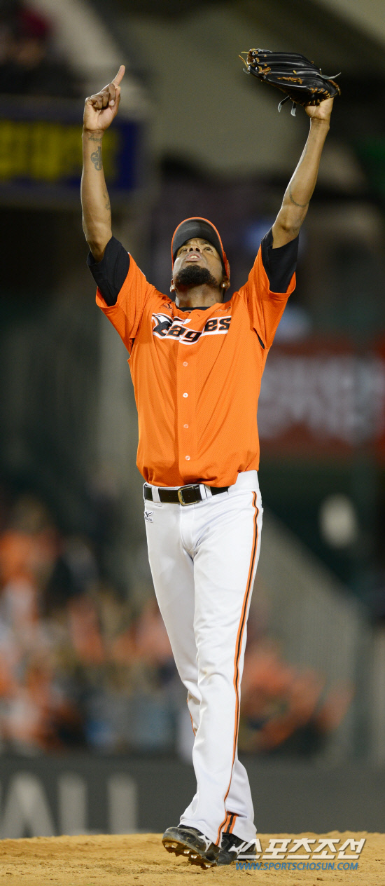 LG와 한화의 2012 프로야구 주중 3연전 마지막 경기가 3일 잠실 야구장에서 펼쳐 졌다. 9회 무사 만루 위기를 넘기고 승리를 지켜낸 한화 바티스타가 좋아하고 있다. 잠실=조병관 기자 rainmaker@sportschosun.com