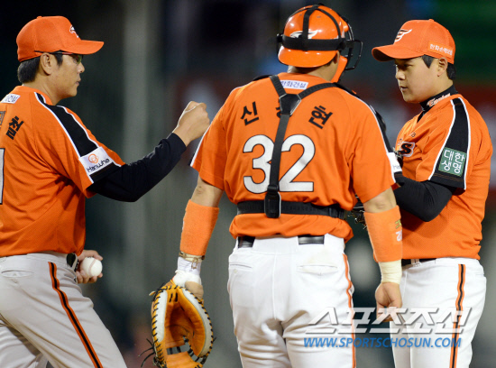 LG와 한화의 2012 프로야구 주중 3연전 마지막 경기가 3일 잠실 야구장에서 펼쳐 졌다. 한화 선발 유창식이 6회 2사후 LG 이진영게게 볼 넷을 허용하자 정민철 투수코치가 마운드에 올라 강판 시키고 있다. 잠실=조병관 기자 rainmaker@sportschosun.com