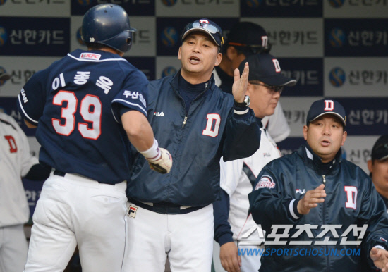 두산 김진욱 감독이 1회 김현수의 적시타때 홈을 밟은 이종욱과 하이파이브를 하고 있다. 잠실=조병관 기자 rainmaker@sportschosun.com
