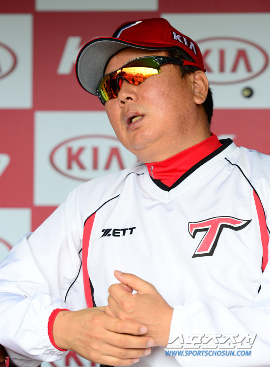 5월2일 광주 무등야구장에서 열린 프로야구 KIA와 SK의 경기에서 경기 전 KIA 선동열 감독이 덕아웃에서 기자들과 대화를 나누고 있다. 광주=송정헌 기자 songs@sportschosum.com/2012.5.2