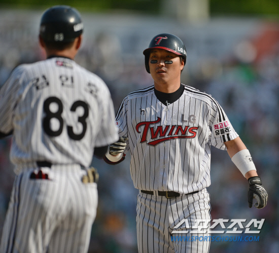 | LG 이진영이 7회말 동점 적시타를 친 후 김인호 1루코치와 하이파이브를 하고 있다. 잠실=김경민 기자 kyungmin@sportschosun.com |