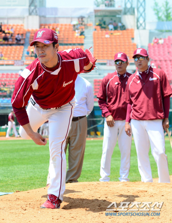 | 6일 광주 무등야구장에서 열린 프로야구 KIA와 넥센의 경기에서 경기 전 넥센 김병현이 김시진 감독과 정민태 코치, 허구연 해설위원이 지켜보는 가운데 불펜 피칭을 선보이고 있다. 김병현이 힘찬 투구를 선보이고 있다. 광주=송정헌 기자 songs@sportschosum.com |