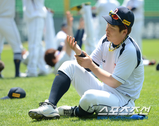 | 두산 김현수가 오른쪽 새끼손가락 부상으로 3경기 연속 결장했다. 경기전 훈련 도중 손가락 상태를 살펴보고 있는 김현수. 잠실=김경민 기자 kyungmin@sportschosun.com |