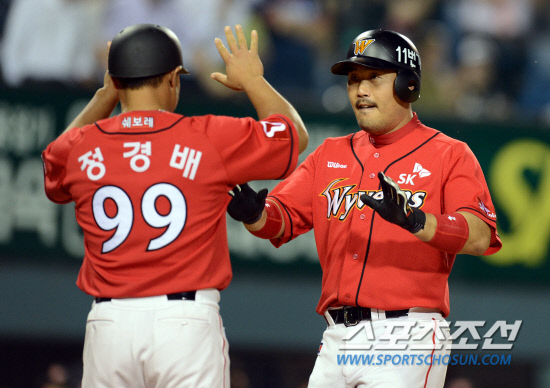 | SK 이호준이 10일 잠실 두산전서 7회초 2사후 중월 솔로 홈런을 치고 정경배 코치와 하이파이브를 하고 있다.잠실=조병관 기자 rainmaker@sportschosun.com |