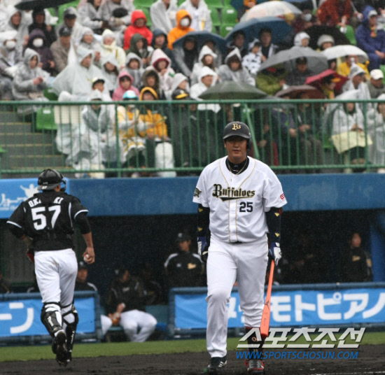 | 오릭스 이대호가 3월 4일 한신과의 시범경기 첫 타석에서 3구 삼진을 당한 뒤 덕아웃으로 돌아가고 있다. 스포츠닛폰 본사제휴 |