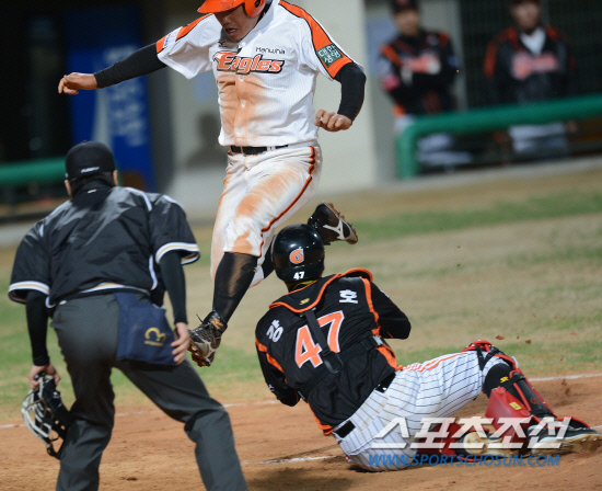 11일 청주구장에서 2012 프로야구 롯데와 한화의 경기가 열렸다. 7회말 2사 1,2루 한화 오선진의 안타 때 2루주자 최진행이 홈으로 들어오며 롯데 포수 강민호의 태그를 피해 점프하며 홈을 밟고 있다. 청주=정재근 기자 cjg@sportschosun.com/2012.05.11/ |