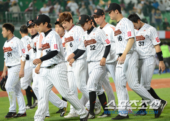 | 15일 부산사직야구장에서 열린 프로야구 롯데와 넥센의 경기에서 넥센에 9대2 대패를 당한 롯데 선수들이 경기 종료 후 그라운드를 내려오고 있다. 부산=송정헌 기자 songs@sportschosum.com/2012.5.15 |