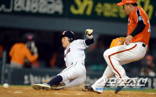 | 두산 허경민이 지난 15일 잠실 한화전서 6회 홈을 파고 들고 있다. 잠실=조병관 기자 rainmaker@sportschosun.com |