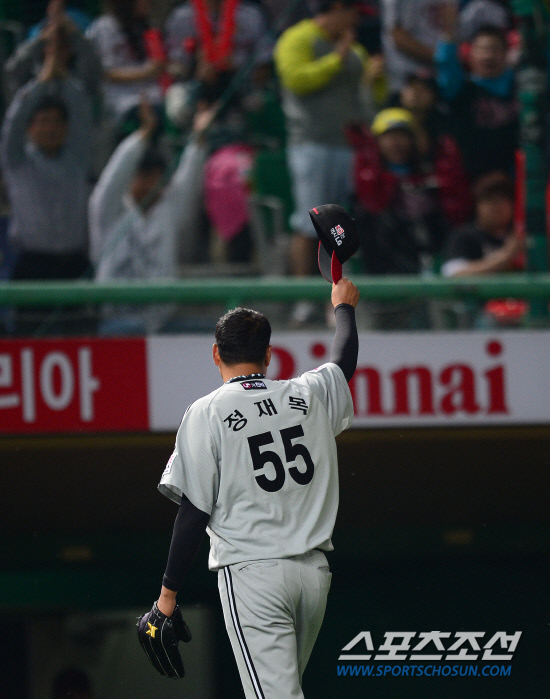 SK전에선 달랐다. 정재복은 원하는 곳에 공을 꽂았다. 최고 스피드는 138㎞로 빠르지 않았다. 하지만 스트라이크존의 구석을 파고든 공에 SK 타선은 제대로 맞추질 못했다. 커브, 슬라이더, 체인지업, 포크까지 다양한 변화구 제구력도 절묘했다. 7회 박재상의 직선타는 유격수 오지환의 글러브로 빨려들어갔다.