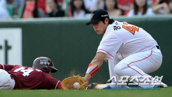 | SK 정상호가 13일 넥센전서 1루수로 나서 투수의 견제구를 받아내는 장면. 전준엽 기자 noodle@sportschosun.com |