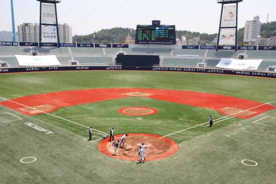 잔디교체 공사는 지난 15일부터 17일까지 진행됐으며, 18일 열린 넥센과의 퓨처스리그(2군) 경기부터 사용된다.