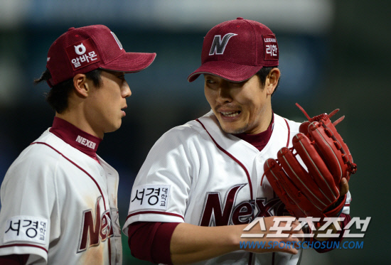 넥센과 삼성의 주말 3연전 첫번째 경기가 18일 목동구장에서 열렸다. 4회초 실점위기를 넘긴 넥센 김병현이 호수비를 펼친 중견수 정수성과 이야기를 나누고 있다. 목동=허상욱 기자 wook@sportschosun.com |