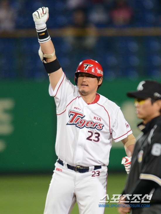 | 22일 광주구장에서 2012 프로야구 한화의 기아의 경기가 열렸다. 8회말 무사 1,2루 기아 최희섭이 2타점 동점 2루타를 치고 환호하고 있다. 광주=정재근 기자 cjg@sportschosun.com/2012.05.22/ |