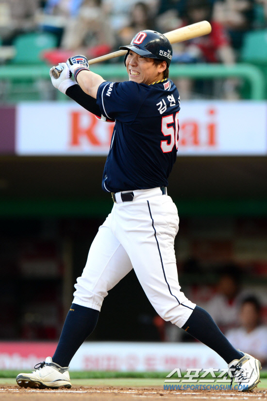 | 두산 김현수가 23일 인천 SK전 1회 타격을 하고 있다. 두산 중심타자들은 시즌초 컨택트 히팅의 컨셉트로 타석에 나서고 있다. 문학. 인천=송정헌 기자 songs@sportschosum.com |