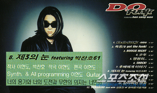 딱 14년 전이었다. 국내 힙합 1세대이자 전설적인 듀오인 '듀스(DEUX)' 출신의 이현도가 솔로 데뷔 후 국내 최정상 기타리스트 겸 작곡가인 한상원 교수와 합작해 98년에 만든 프로젝트 앨범 'D.O.funk'에 박찬호의 가사와 목소리가 실려있던 것. 박찬호는 8번 트랙 '제3의 눈'이라는 곡에 공동 작사가로 이름이 기재돼 있다. 게다가 '박찬호61'이라는 힙합 스타일의 이름을 걸고 랩과 내레이션 피처링을 했다.
