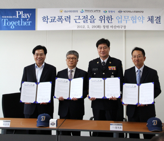NC는 29일 오전 11시30분 창원 마산야구장에서 경남지방경찰청, 경상남도교육청, 창원시 관계자들이 참석한 가운데 학교폭력 예방 및 근절을 위한 업무협약식을 가졌다. 이날 협약식에는 NC 이태일 대표, 경남지방경찰청 정지효 차장, 창원시 조기호 부시장, 경상남도교육청 최상현 관리국장 등이 참석했다.