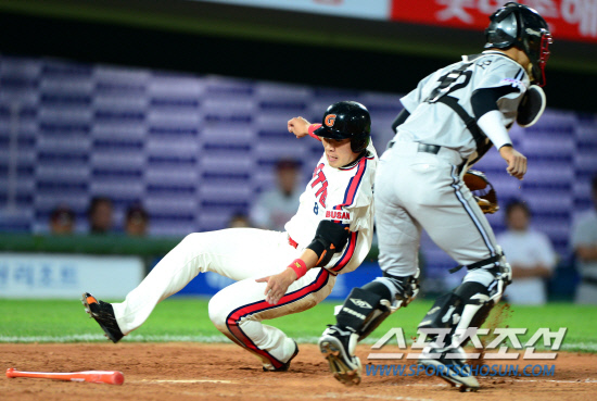 | 롯데 전준우가 30일 LG전 4회 1사 1,3루에서 황재균의 스퀴즈번트 때 3루에서 득점에 성공했다. 부산=송정헌 기자 songs@sportschosum.com |