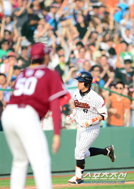 | 2일 부산 사직구장에서 롯데와 넥센이 경기를 가졌다. 롯데 강민호가 1회 넥센 김영민을 상대로 좌중월 만루포를 날렸다. 아쉬워하고 있는 김영민(왼쪽) 옆으로 당당하게 그라운드를 돌고 있는 강민호. 부산=송정헌 기자 songs@sportschosum.com |