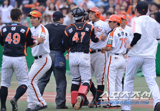 한 다리 건너면 선후배로 얽히는 국내 프로야구에서는 후배가 선배 투수의 공에 맞아도 빈볼처럼 고의성이 없다면 조용히 넘어가는 경우가 많다. 대전=민창기 기자 huelva@sportschosun.com