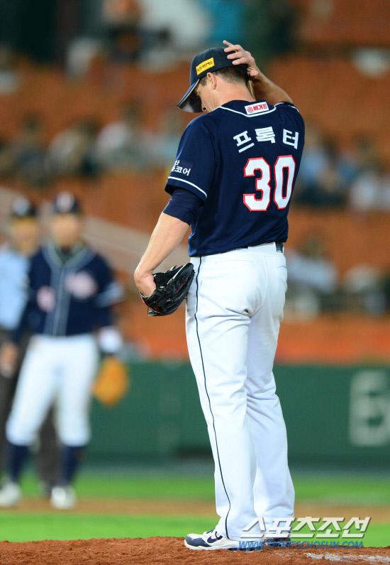 12일 부산사직구장에서 롯데와 두산의 주중 첫 경기가 열렸다. 11회 마무리를 위해 마운드에 오른 프록터가 롯데 정보명에게 적시타를 허용하며 1실점 블론세이브를 기록했다. 아쉬운 듯 모자를 만지고 있는 프록터. 부산=송정헌 기자 songs@sportschosum.com