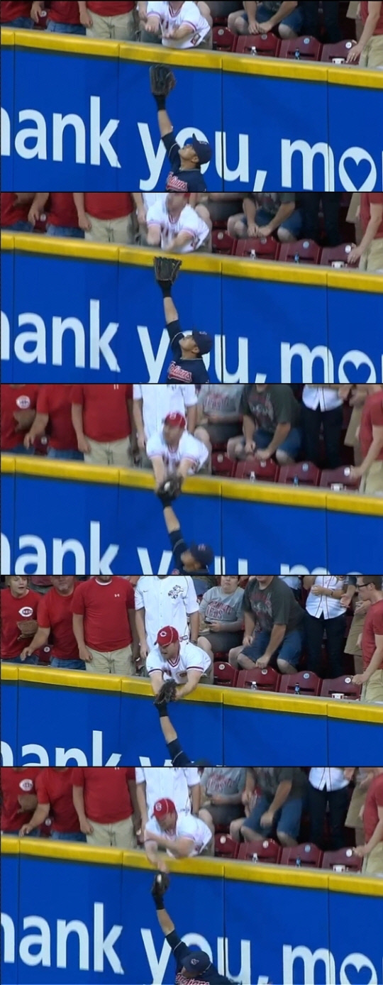 14일 신시내티 전에서 관중 방해에도 불구, 집중력을 잃지 않은 추신수의 멋진 수비. 만약 그가 공을 떨어뜨렸더라면 어떻게 됐을까. 국내 야구장에서도 흔히 나올 수 있는 장면이다.