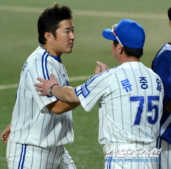 삼성과 한화의 주중 3연전 첫번째 경기가 12일 대구구장에서 열렸다. 삼성이 한화에 9대3으로 승리를 거뒀다. 4타수 3안타 6타점으로 맹활약한 최형우가 류중일 감독과 기쁨을 나누고 있다. 대구=허상욱 기자 wook@sportschosun.com/2012.06.12/ |