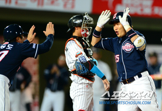 | 두산 양의지가 14일 부산 롯데전에서 9회 역전 투런포를 날린 후 전형도 코치와 양손 하이파이브를 하고 있다. 부산=송정헌 기자 songs@sportschosum.com |