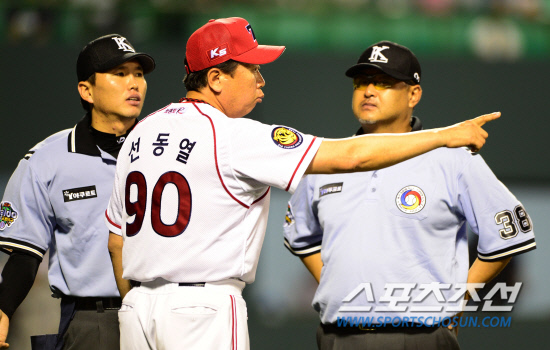 15일 군산 월명야구장에서 프로야구 KIA와 LG의 경기가 열렸다. 11회 KIA 윤완주가 헛스윙 삼진을 당했다. 윤완주는 파울팁이라고 주장 했지만 심판진은 판정을 번복하지 않았다. 심판 판정에 대해 항의하고 있는 선동열 감독. 군산=송정헌 기자 songs@sportschosum.com/2012.6.15