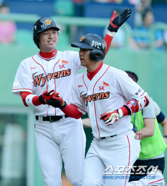 1회말 SK 최정이 좌측담장을 넘어가는 선제 2점홈런을 치고 선행주자 임훈과 기쁨을 나누고 있다. 인천=허상욱 기자 wook@sportschosun.com