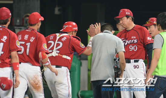 프로야구 넥센과 KIA의 경기가 14일 목동야구장에서 펼쳐졌다. 9대6 승리를 거둔 KIA 선동열 감독이 선수들과 하이파이브를 나누고 있다. 목동=전준엽 기자 noodle@sportschosun.com