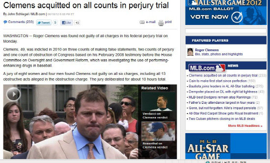 19일(한국시각) 폭스스포츠 등 미국 언론들은 '미국 워싱턴 연방법원에서 속개된 재판에서 클레멘스가 무죄 평결을 받았다'는 사실을 주요기사로 일제히 보도했다.