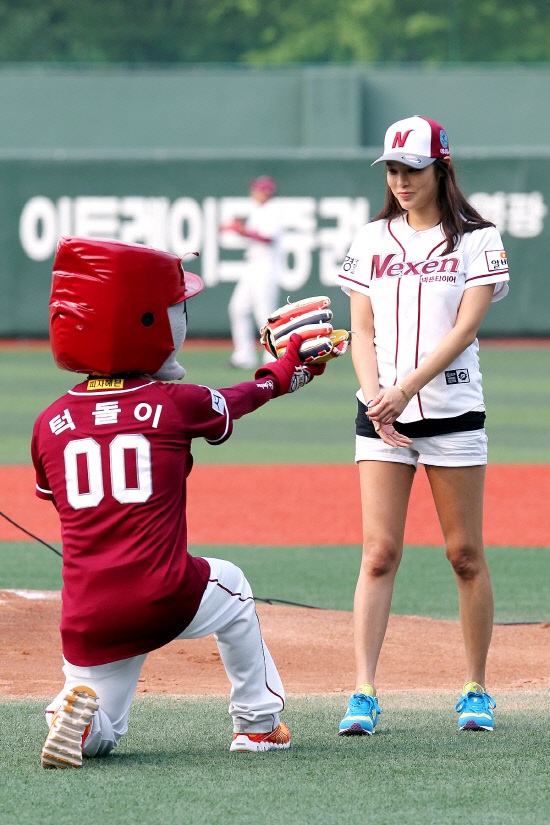 영화 '간기남'의 히로인 박시연이 25일 서울 목동구장에서 열린 넥센-삼성과의 프로야구 경기에 시구자로 나섰다. 넥센 유니폼 상의에 핫팬츠 차림으로 등장한 박시연은 S라인 몸매를 이용한 멋진 와인드업으로 눈길을 끌었다. 시구를 마친 뒤엔 넥센 마스코트 턱돌이로부터 글러브 고백을 받기도 했다. 여성 연예인 시구자에게 스킨십을 하는 것으로 '악명'이 높은 턱돌이는 이날 '임자있는 사람은 건드리지 않는다'면서 신혼인 박시연에게 깍듯하게 예의를 갖춰 또 다른 재미를 줬다. <스포츠조선닷컴, 사진제공=스타엔>
