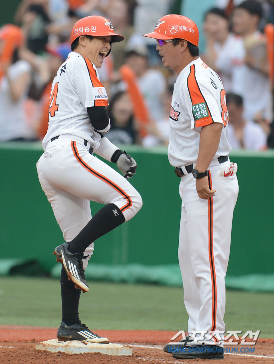 프로야구 두산과 한화의 경기가 23일 대전 한밭야구장에서 펼쳐졌다. 4회말 2사 만루 이대수가 0대0의 균형을 깨는 2타점 적시타를 날리고 1루에서 환호하고 있다. 대전=전준엽 기자 noodle@sportschosun.com