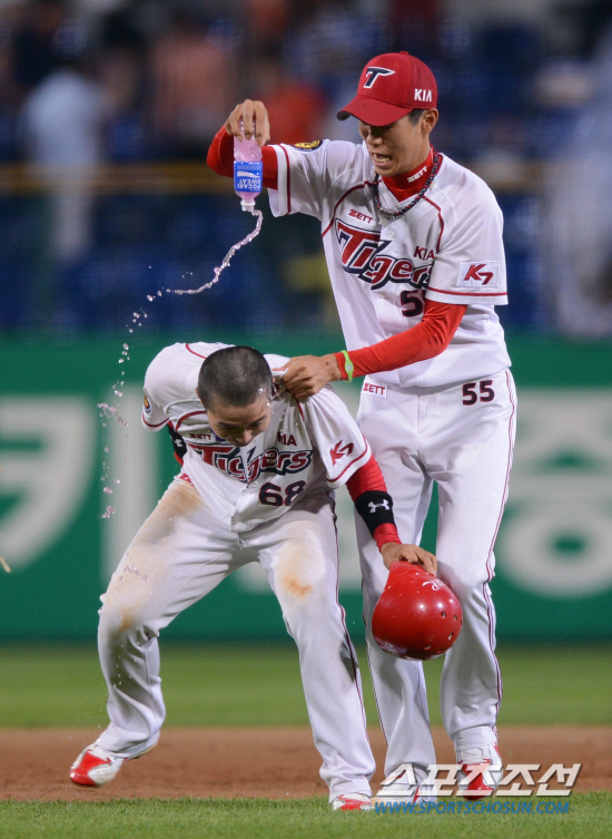 24일 오후 광주 무등경기장에서 2012 프로야구 SK와 KIA의 경기가 열렸다. 9회말 1사 만루서 이용규의 내야 땅볼 때 유격수 실책으로 승리를 거둔 후 KIA 홍성민이 동점타의 주인공 윤완주(맨 왼쪽)에게 물을 뿌리며 기뻐하고 있다. 광주=김경민 기자 kyungmin@sportschosun.com / 2012.06.24.