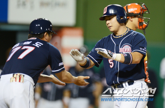 프로야구 한화와 두산의 경기가 24일 대전 한밭야구장에서 펼쳐졌다. 연장 10회초 윤석민이 역전 솔로포를 터뜨리고 축하를 받고 있다. 대전=전준엽 기자 noodle@sportschosun.com