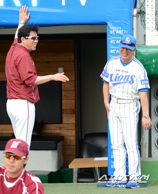 넥센 김시진 감독(왼쪽)이 삼성 류중일 감독과 경기전 담소를 나누고 있다. 대구=허상욱 기자 wook@sportschosun.com