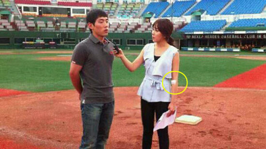 '야구여신' 팔에 커다란 반창고가?