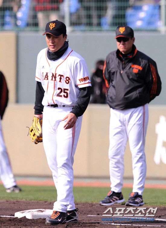이승엽이 2010년 2월 미야자키 스프링캠프에서 하라 요미우리 감독이 지켜보는 가운데 훈련을 하고 있다. 스포츠조선 DB