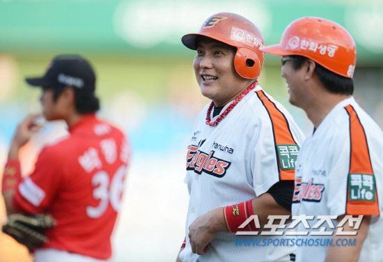 프로야구 한화와 SK의 경기가 7일 대전 한밭야구장에서 펼쳐졌다. 6회말 1사 2루 김태균이 역전 적시타를 날리고 환하게 웃고 있다. 대전=전준엽 기자 noodle@sportschosun.com/2012.07.07/ |