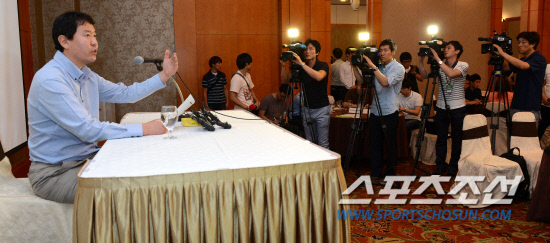 | 지난달 25일 선수협 임시총회에서 박충식 사무총장이 10구단 창단과 관련해 올스타전 보이콧을 결정한 것을 취재진에 설명하고 있다. 허상욱 기자 wook@sportschosun.com |