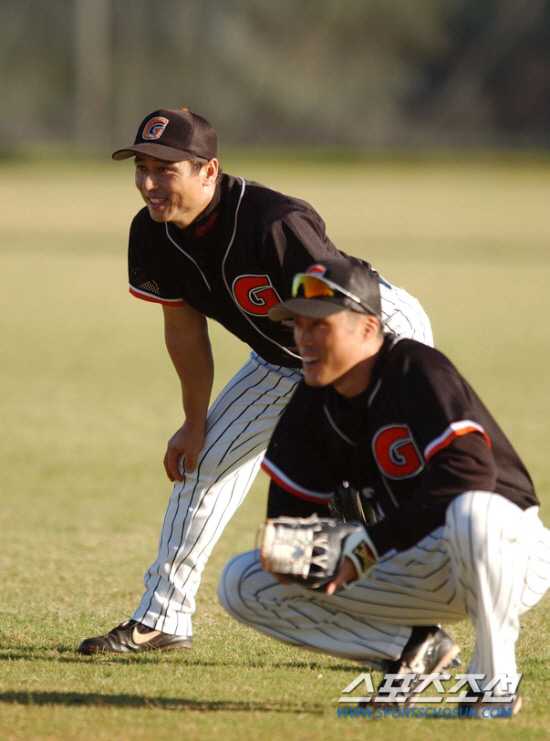 ◇2004년 호주 골드코스트 전지훈련 당시 박정태(현 타격코치)와 조성환이 나란히 훈련에 힘하고 있다. 송정헌 기자 songs@sportschosun.com