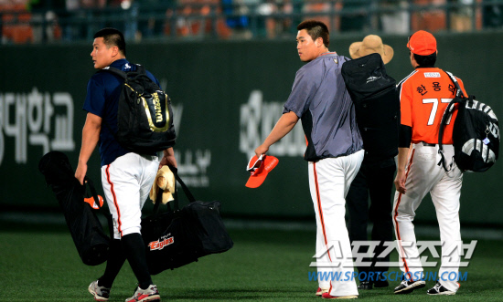 | 7월 4일 서울 목동구장에서 열린 프로야구 넥센과 한화의 경기에서 한화가 넥센에 10대5로 패하며 8연패를 당했다. 경기 종료 후 그라운드를 빠져 나가고 있는 한화 선수들. 한화 김태균(왼쪽)과 류현진이 무거운 발걸음을 옮기고 있다. 목동=송정헌 기자 songs@sportschosun.com |