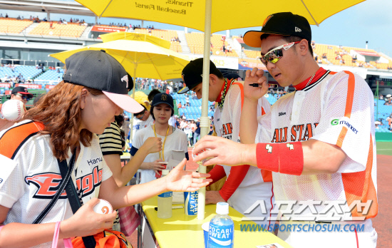 반면 올스타전 첫 출전인 윤희상의 사인부스는 상대적으로 한가했다. 윤희상은 "제가 인기가 별로 없을 준 알고 있었어요. 그래도 (최)정이 옆에 있으니까 그 팬들이 어느 정도는 올 줄 알았죠"라고 웃었다. 그러면서 "그런데 망했어요. 저는 사인 두 번했나"라고 겸연쩍은 미소를 지었다. 옆에 있던 최 정에게 묻자 "전 다섯차례 정도 했어요"라고 덧붙였다.