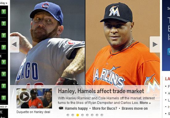 평균자책 1위(2.25)를 다투고 있는 시카고 컵스 에이스 라이언 뎀스터도 트레이드 선상에 올랐다. 컵스는 NL 동부조 선두 싸움을 벌이고 있는 애틀랜타로 뎀스터를 보내고, 유망주 투수 랜달 델가도를 받는 트레이드에 합의했다. 하지만 LA다저스 행을 원하고 있는 뎀스터의 애트랜타로의 트레이드 거부 의사로 인해 난항에 빠진 상황. 선발을 원하고 있는 애틀랜타는 밀워키 에이스 잭 그레인키로 사냥 목표를 이동했다. 하지만 딜이 쉽지만은 않다. 그레인키와의 연장 계약 문제가 남아있는데다 밀워키는 애틀랜타 최고 유망주 투수 훌리오 테헤란을 대가로 원하고 있다.