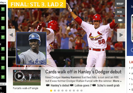 NL 서부조 1위를 노리는 LA다저스도 빅 바이어로 나섰다. 동부조 하위로 처진 마이애미로부터 대형 내야수 헨리 라미레즈 영입에 성공했다. 좌완 셋업맨 랜디 초트(15홀드, 2.39)까지 얻었다. 대가는 투수 나산 이발디와 마이너리거 스캇 맥거인 것으로 알려졌다. 3차례 올스타와 신인왕에 빛나는 라미레즈 영입을 위해 보스턴, 토론토, 오클랜드가 경합을 벌였으나 결국 다저스가 승자가 됐다. 다저스는 3루수를 맡게될 라미레즈가 맷 켐프와 안드레 이디어와 함께 팀 타선의 해결사 역할을 기대하고 있다. 다저스의 득점력은 리그 12위에 그치고 있다.