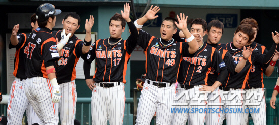 선두 탈환을 노리는 두산과 롯데가 27일 잠실 야구장에서 만났다. 롯데 강민호가 2회 2사후 좌중월 솔로 홈런을 치고 동료들과 하이파이브를 하고 있다. 잠실=조병관기자 rainmaker@sportschosun.com/2012.07.27/ |