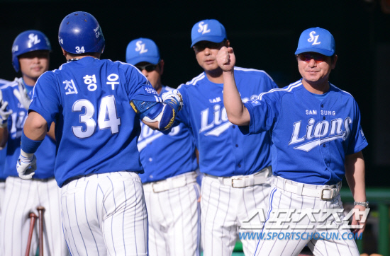 | 29일 오후 서울 목동 야구장에서 2012 프로야구 삼성과 넥센의 경기가 열렸다. 2회초 삼성 최형우가 우중월 솔로 홈런을 친 후 덕아웃에서 류중일 감독과 하이파이브를 나누고 있다. 목동= 김경민 기자 kyungmin@sportschosun.com |