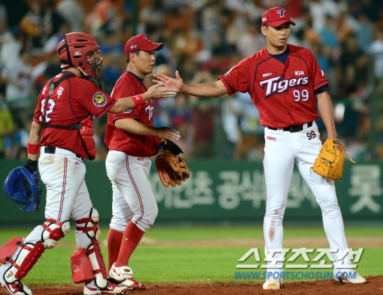 롯데와 KIA의 주중 3연전 마지막날 경기가 2일 부산 사직구장에서 열렸다. 4대3으로 승리를 지켜낸 KIA 최향남-차일목 배터리가 하이파이브를 하고 있다. 부산=허상욱 기자 wook@sportschosun.com