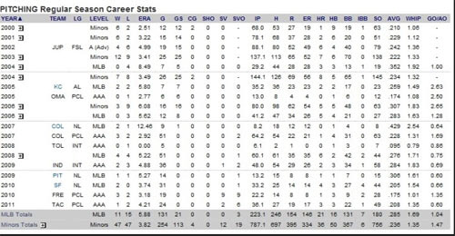 메이저리그에서는 총 131경기 중에 21경기를 선발투수로 등판을 했고, 마이너리그에서는 254 경기 중에 113경기를 선발로 나왔습니다.